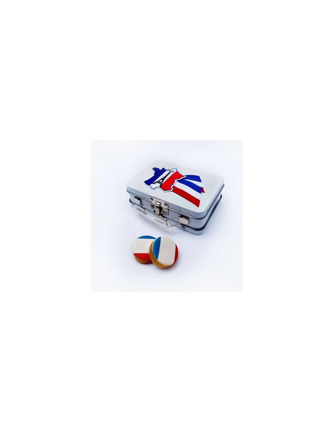 Cette présentation est idéale pour offrir comme souvenir ou cadeau à des amis à l'étranger, ou pour des événements à thème français, comme un mariage dans un autre pays. La combinaison de la mini valise décorative et des calissons colorés aux couleurs du drapeau français ajoute une touche unique et patriotique à votre cadeau.