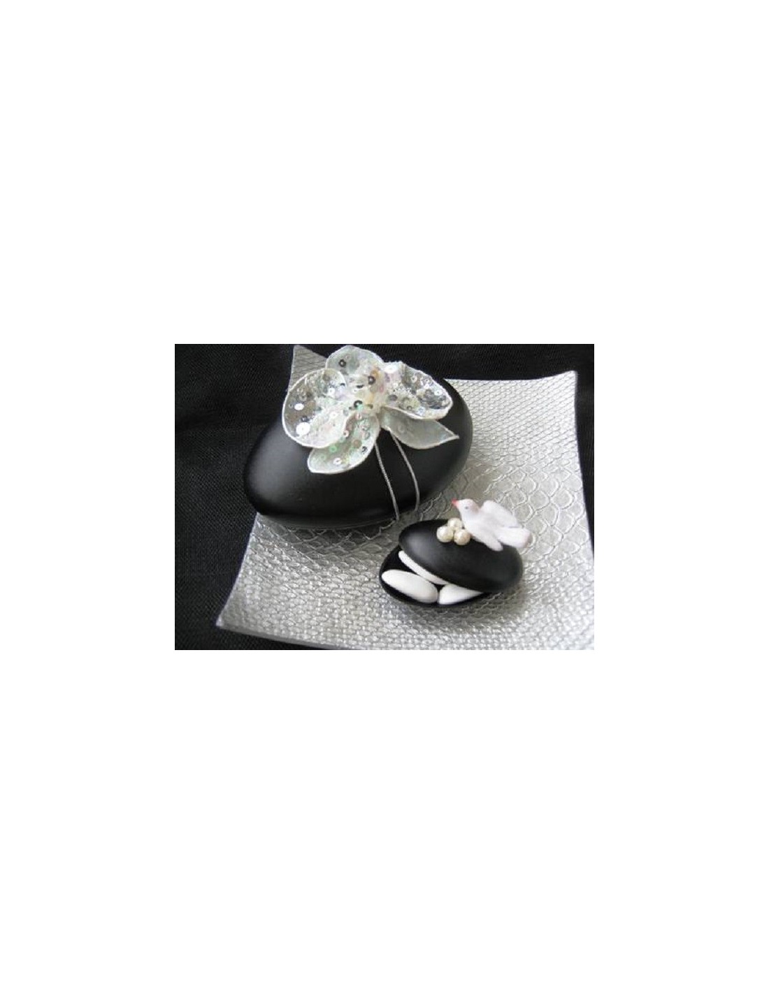 Galet noir, avec 50 à 60 grammes de dragées, orchidée blanche avec sequins pour un décor sublime à offrir , Existe en blanc. Galet séparable, vendu avec des dragées blanches marque Médicis.