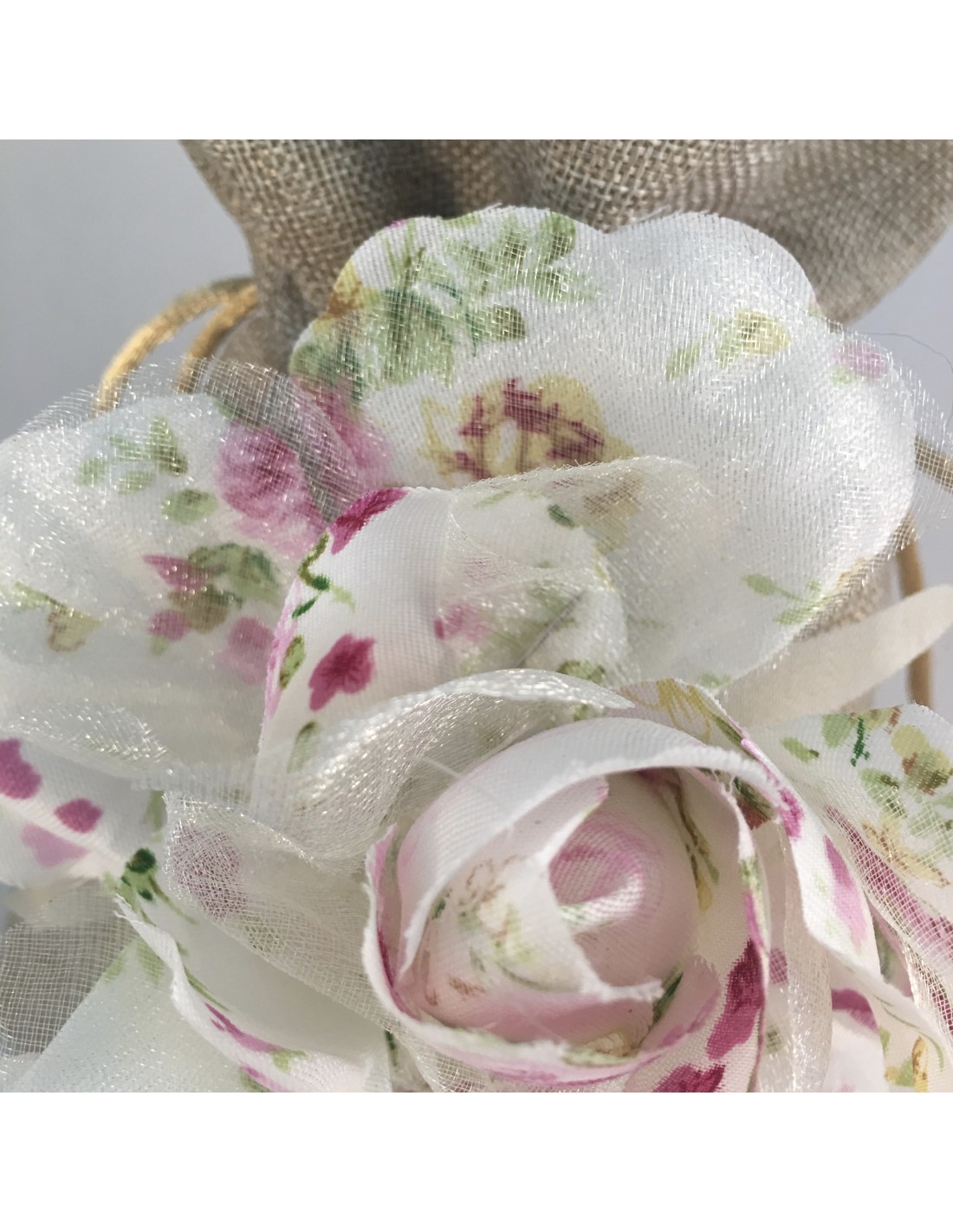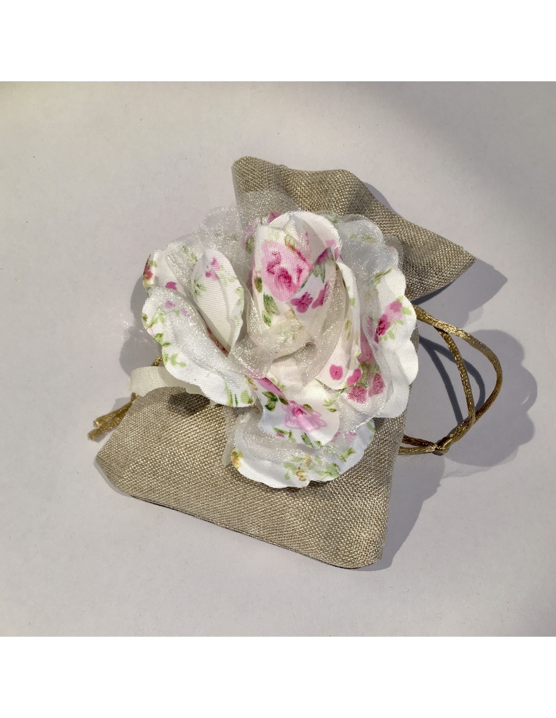 Pochon jute beige clair cousu une belle shabby fleur imprimée,utilizé pour mettre vos bijoux ou autre.
