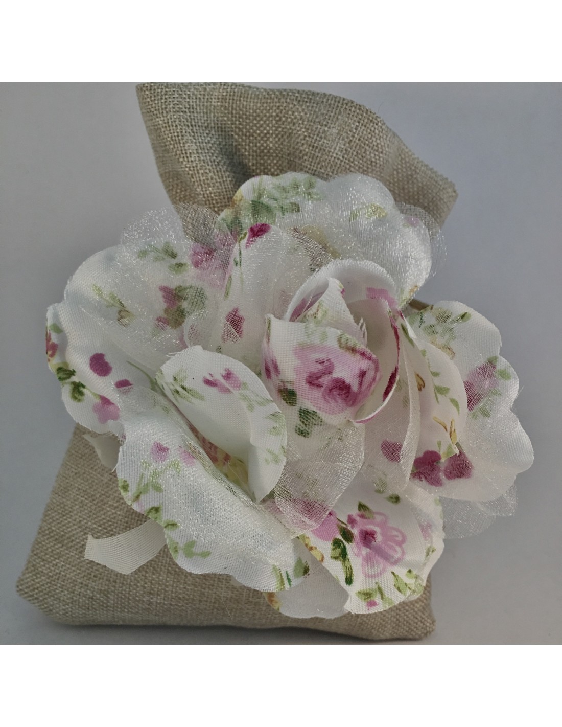 Sachet beige coton  avec une belle fleur shabby vintage imprimée