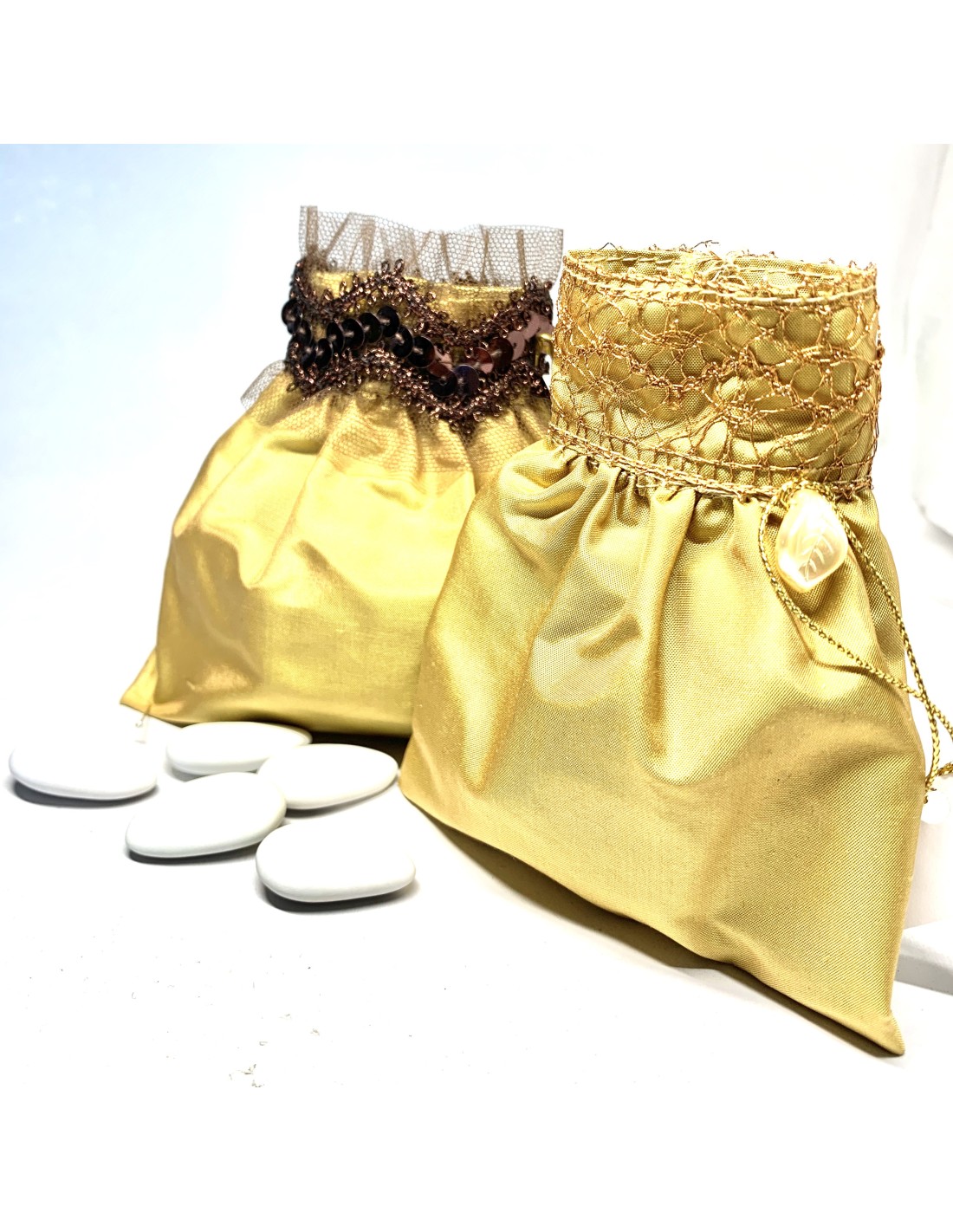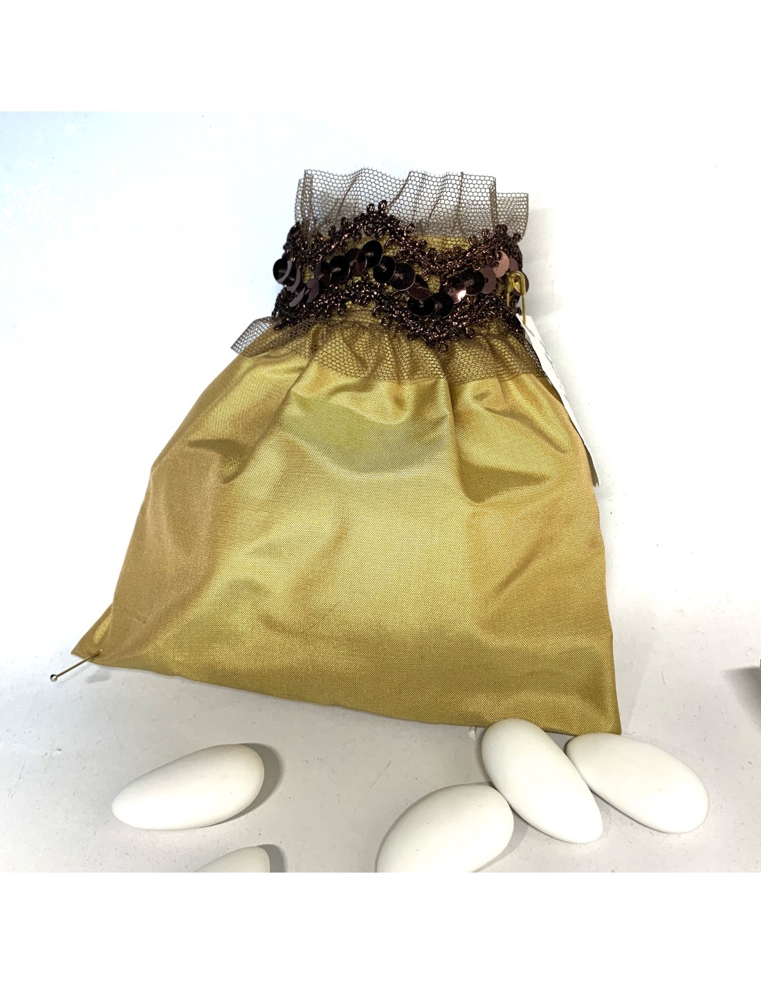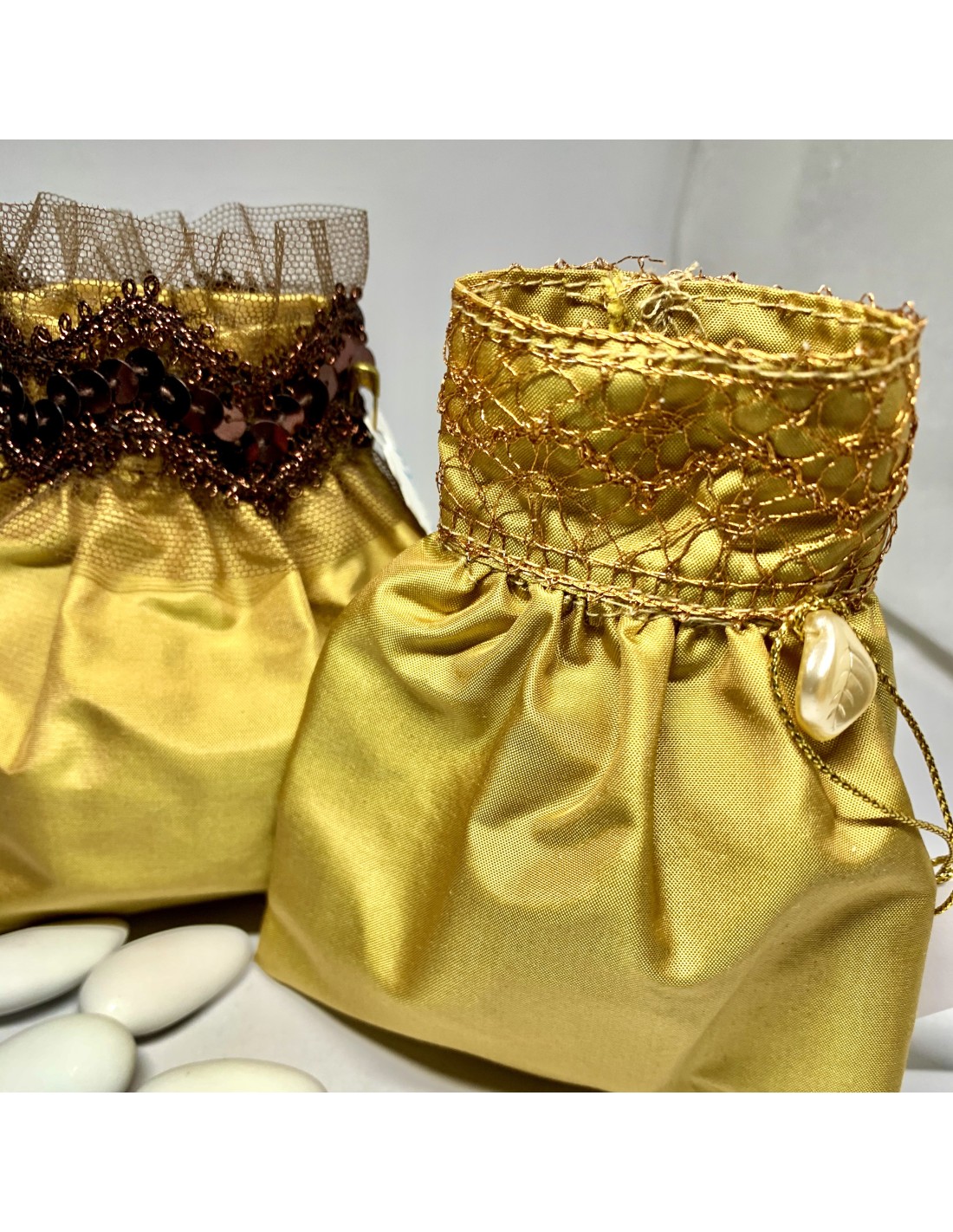 Dragées pochon fait main 100 % soie couleur ocre finition en deux versions gallon avec pailletes maroon ou dentelle dorée.