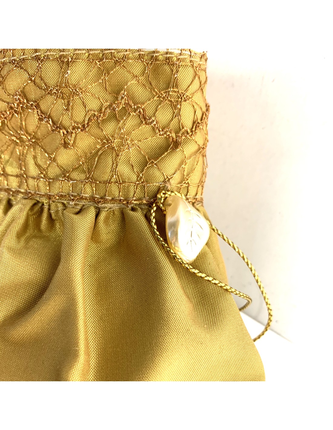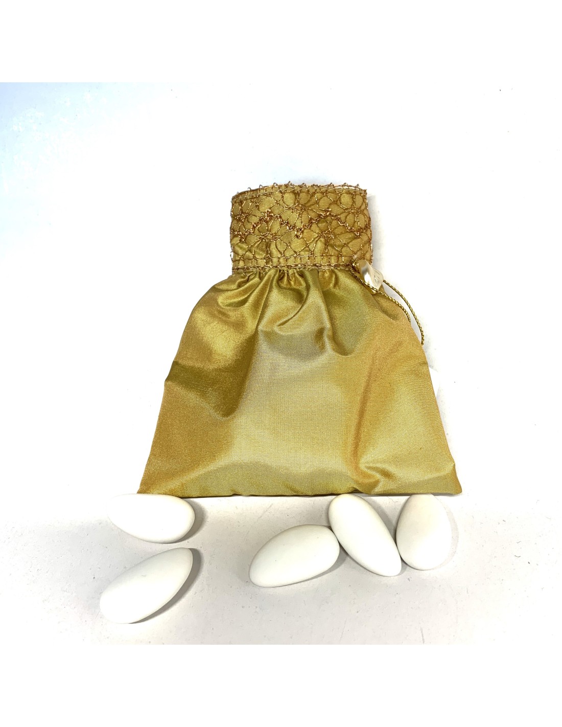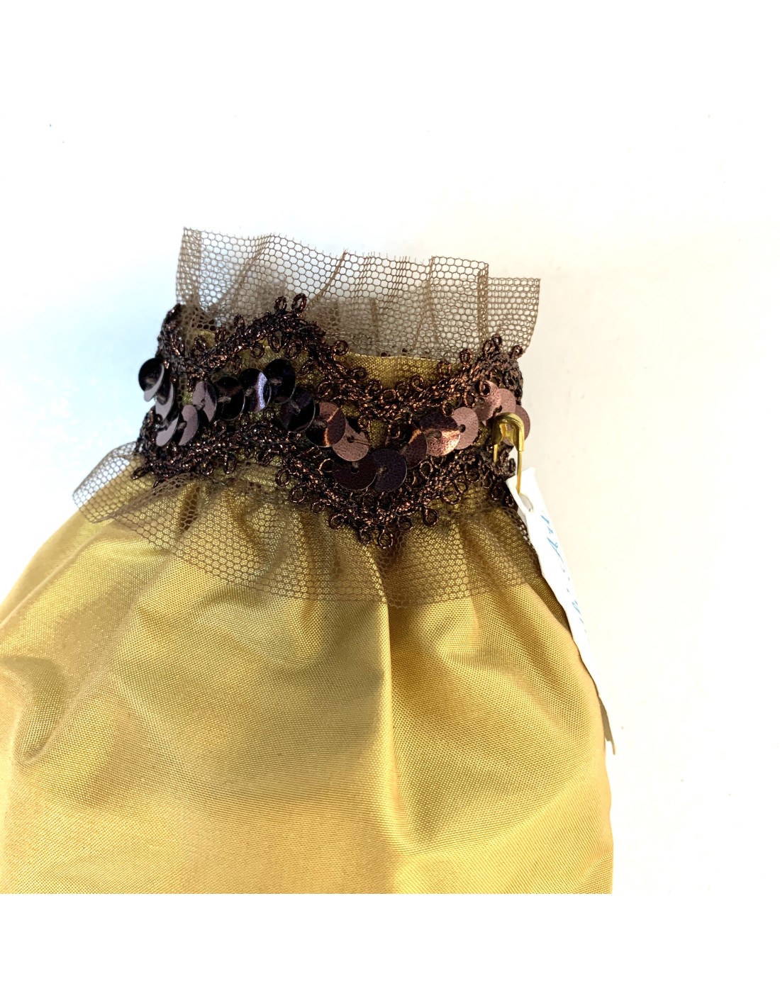 Dragées pochon fait main 100 % soie couleur ocre finition en deux versions gallon avec pailletes maroon ou dentelle dorée.
