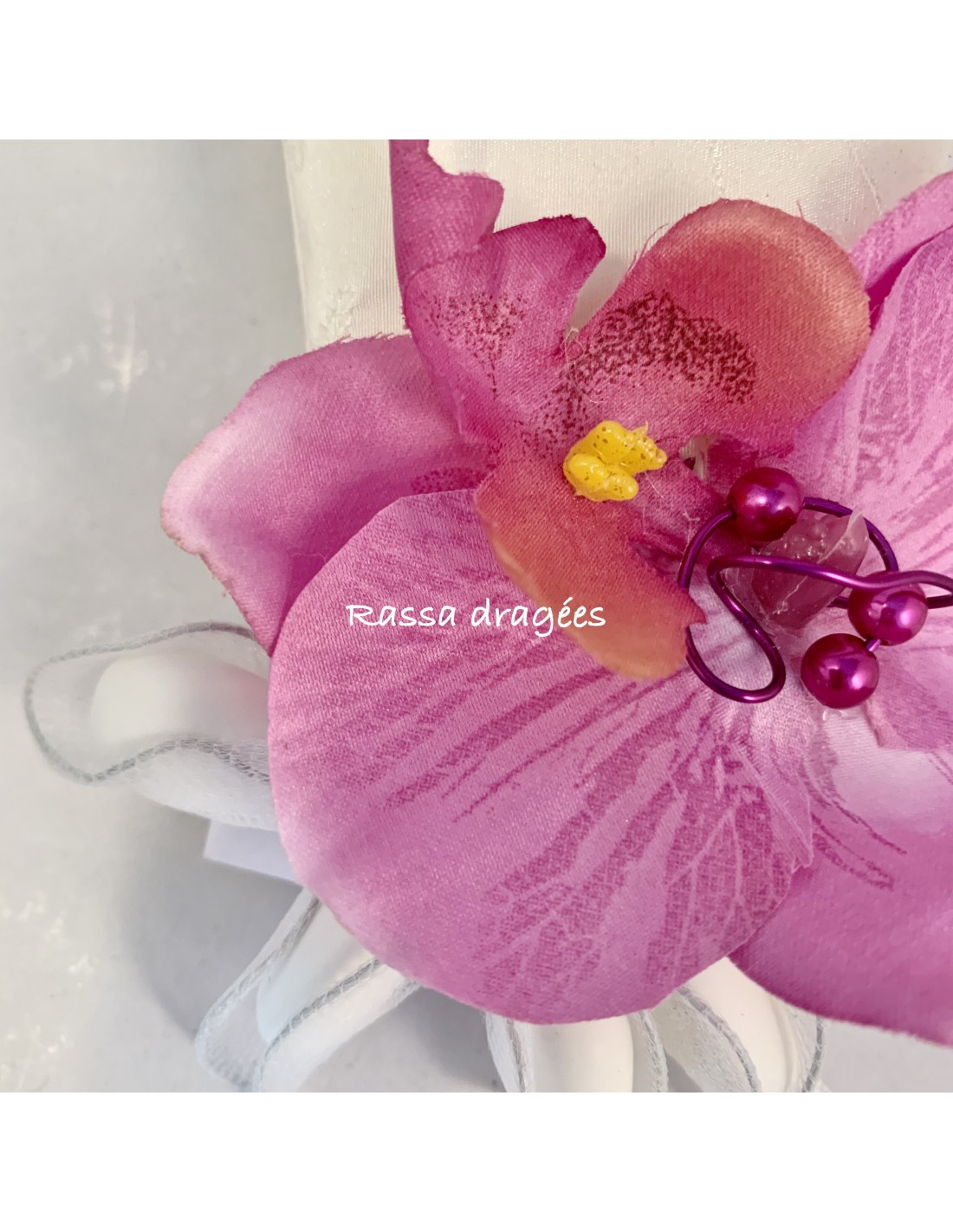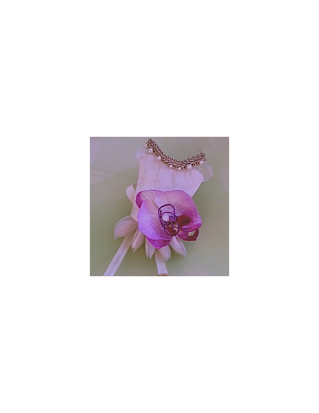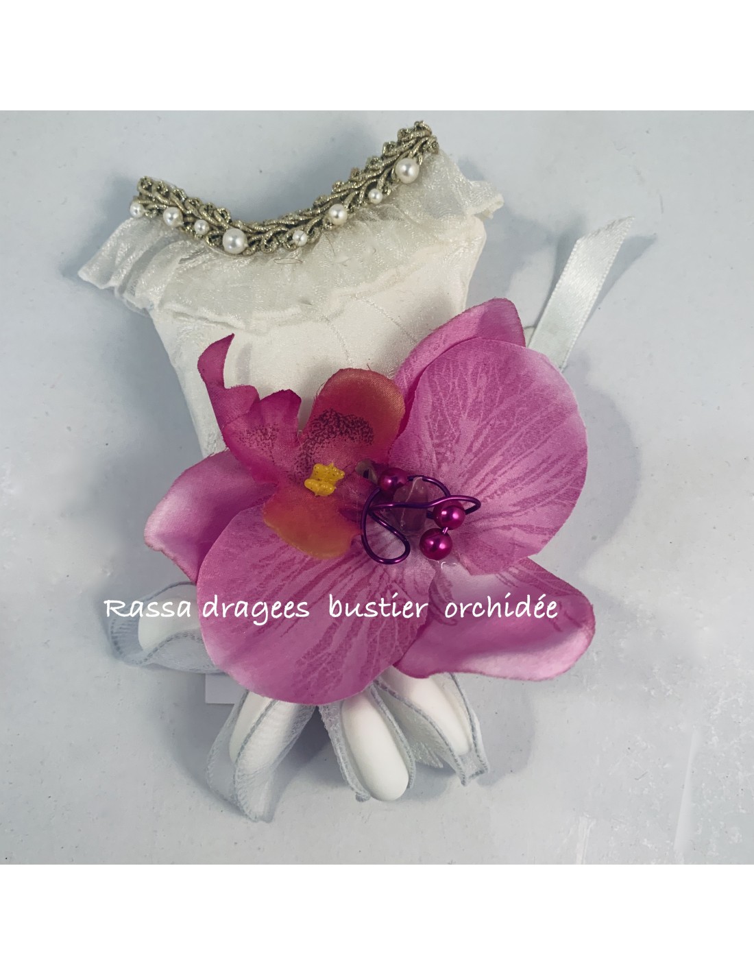 Ivory bodice slightly padded with beaded lace , and on the waist line, a flower supreme orchid is placed.The jordan almonds are placed in the petals and terminated with ribbon.