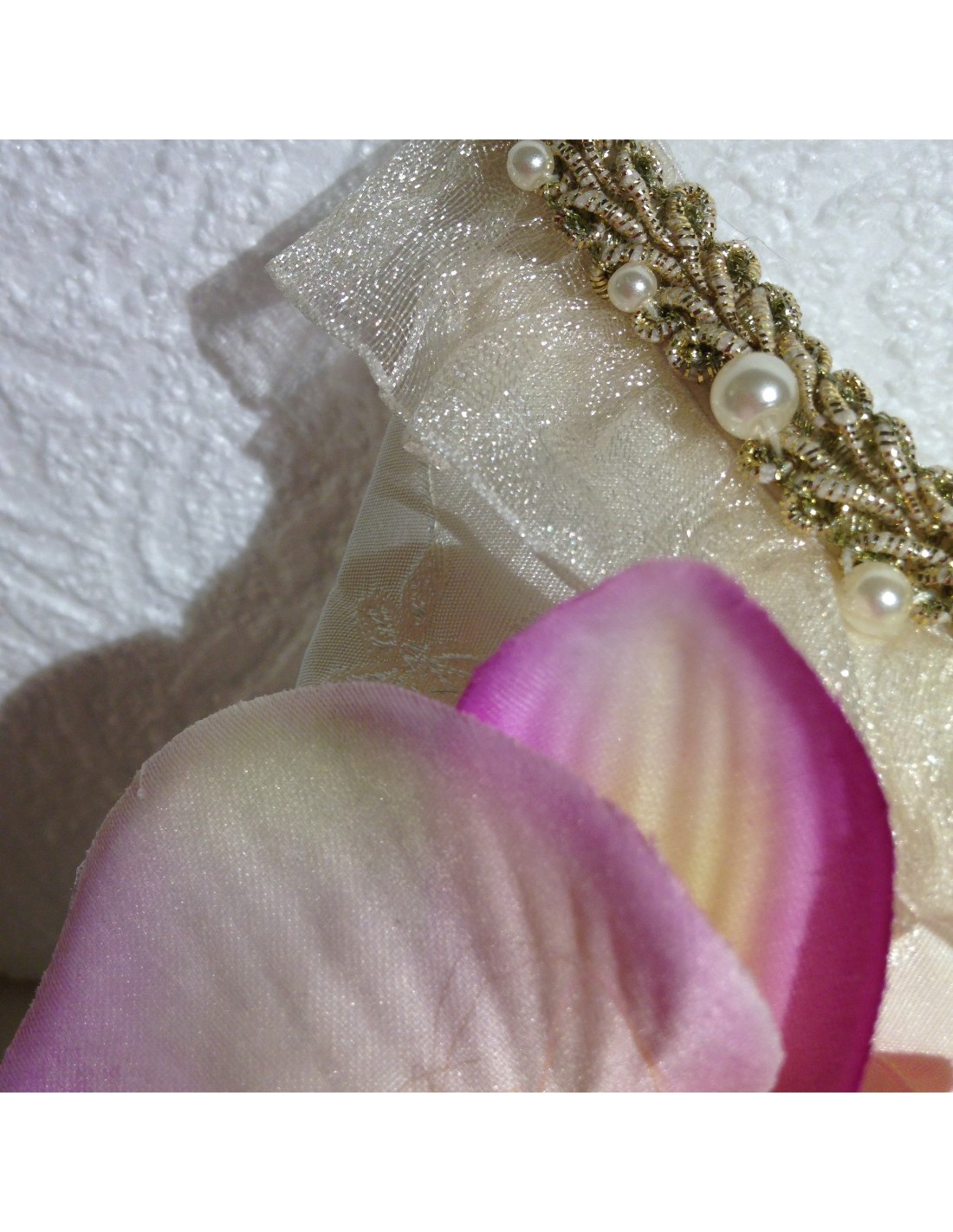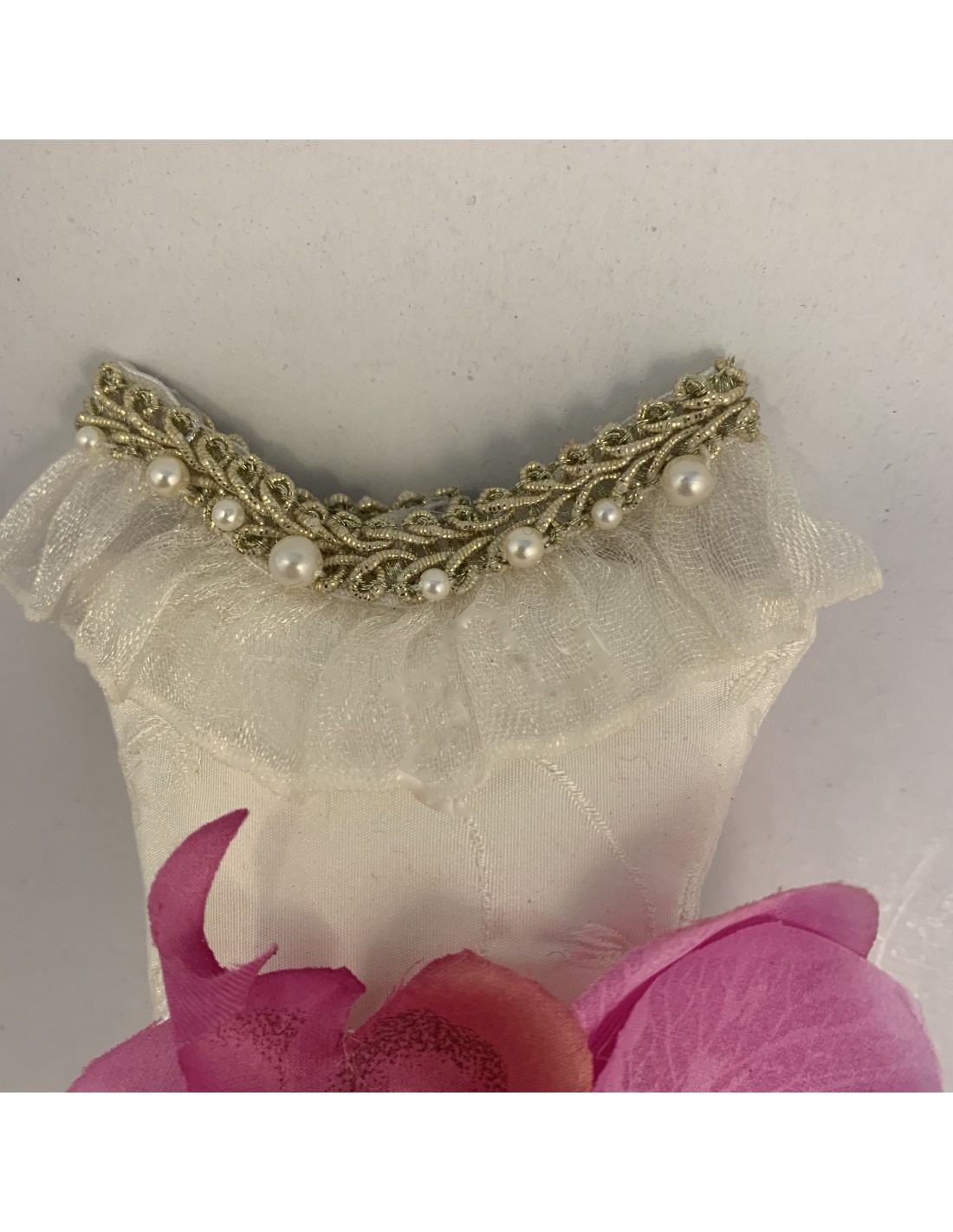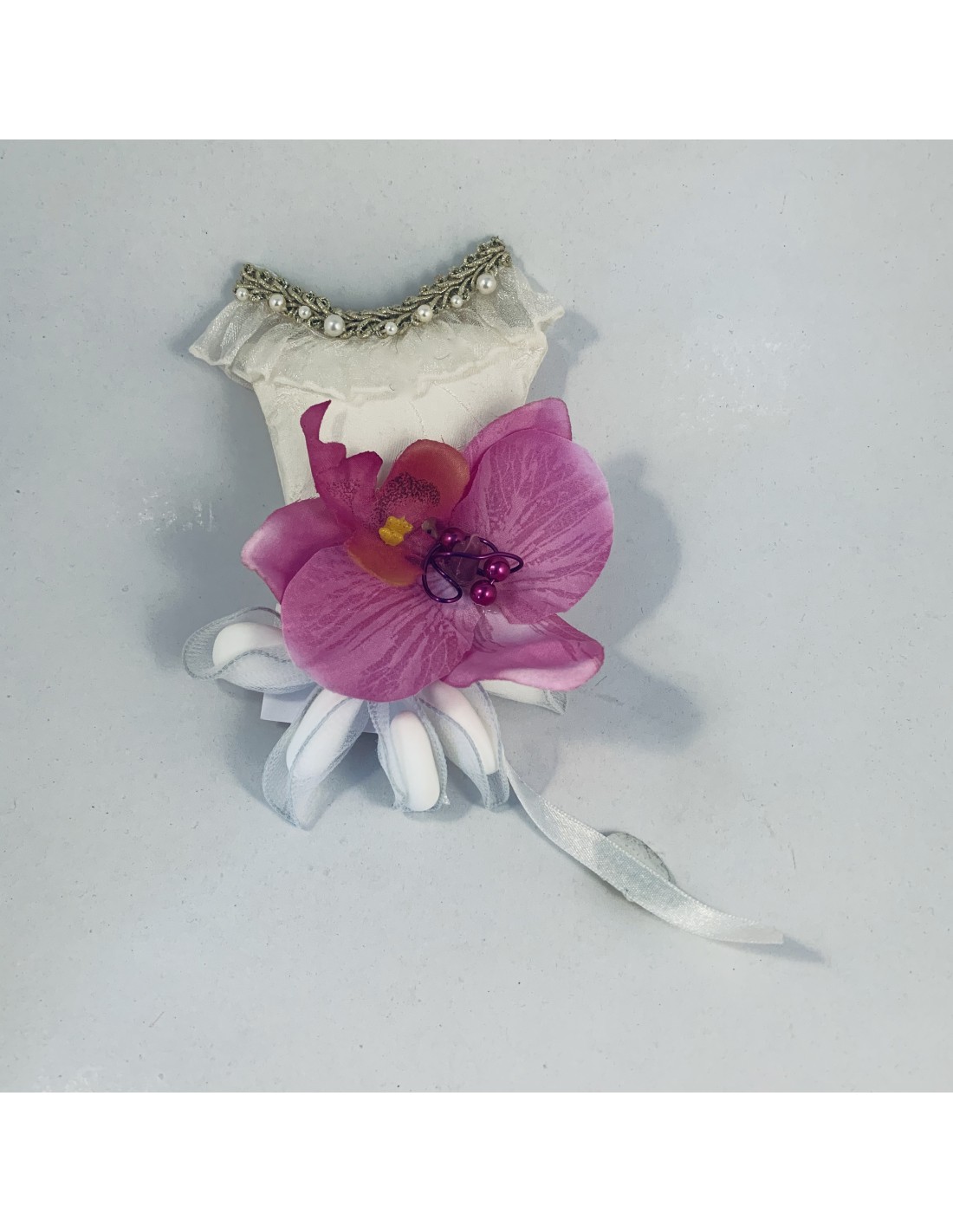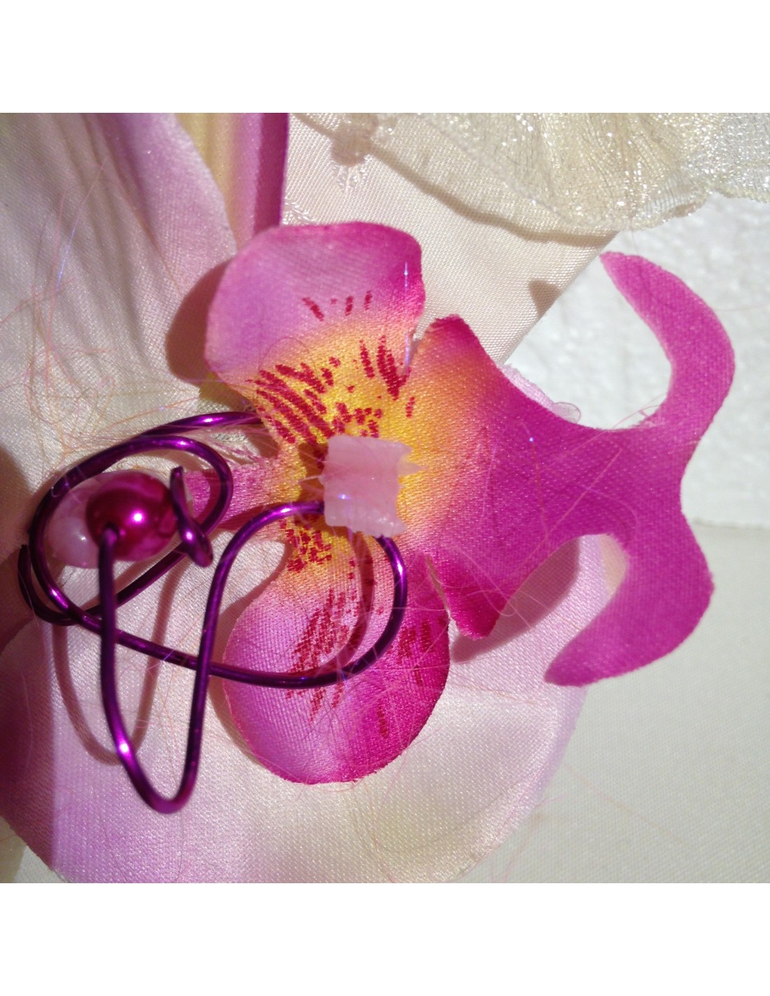 Ivory bodice slightly padded with beaded lace , and on the waist line, a flower supreme orchid is placed.The jordan almonds are placed in the petals and terminated with ribbon.