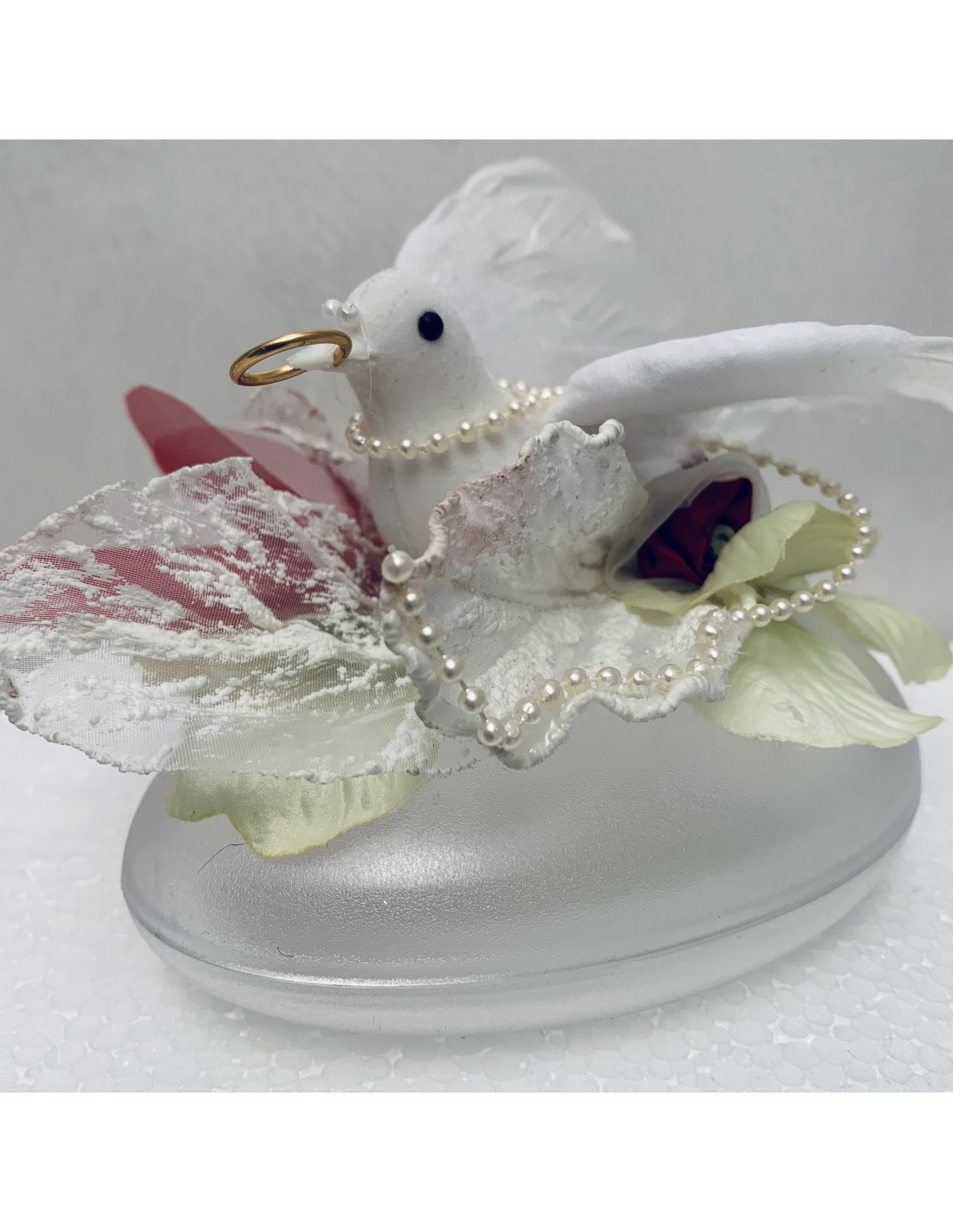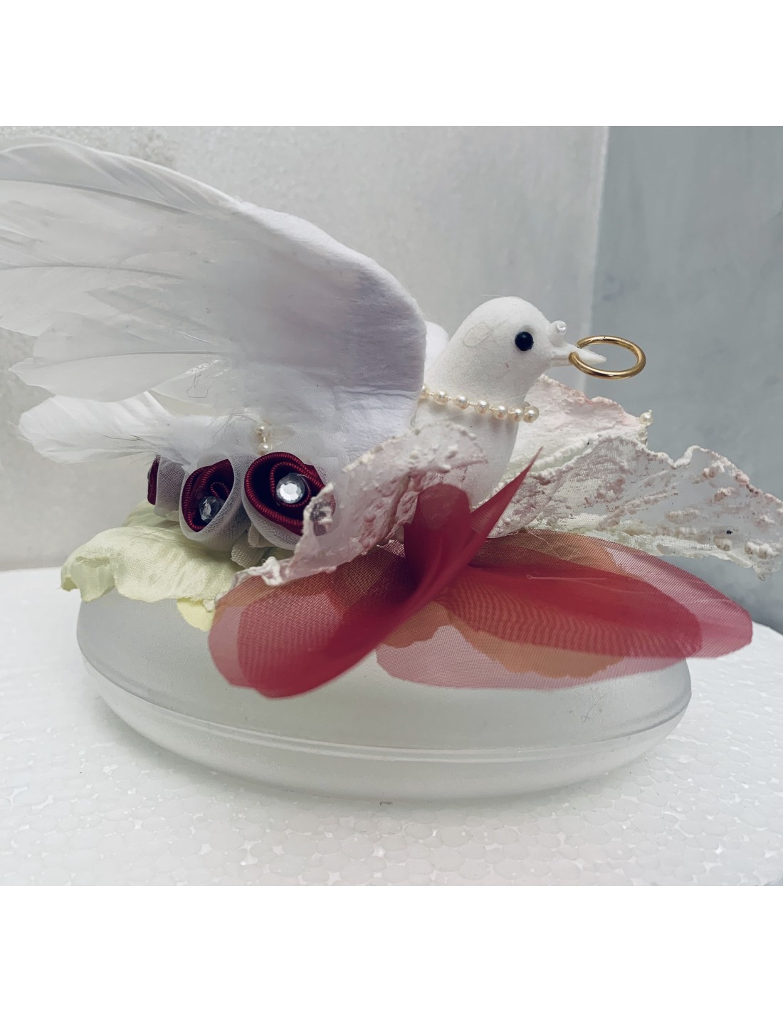 Decorated with a feathered dove, surrounded by white romantic leaves and tiny burgandy roses.