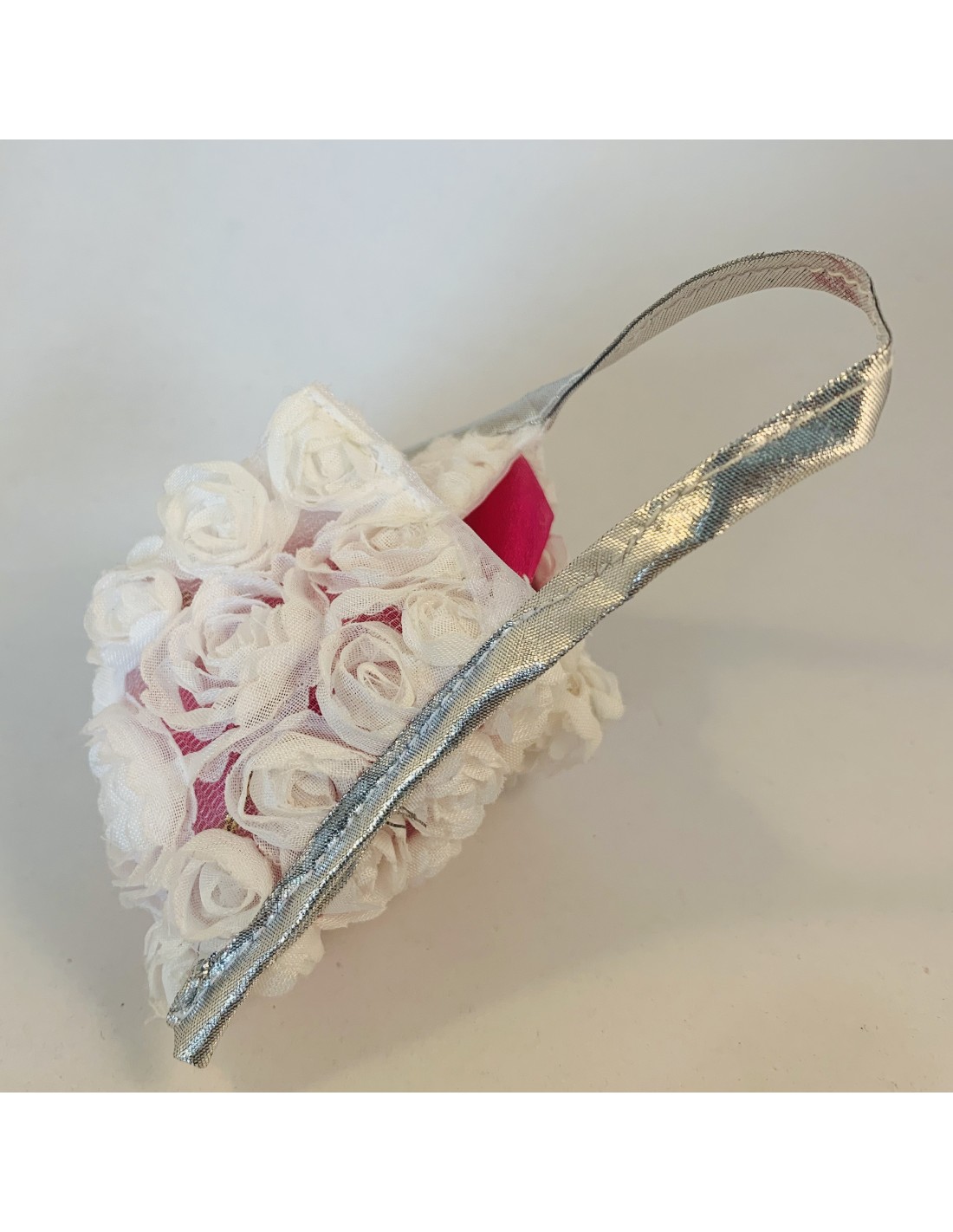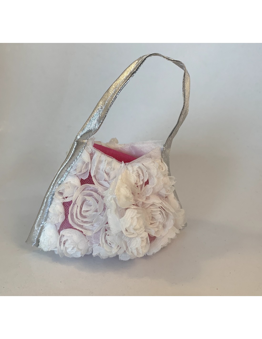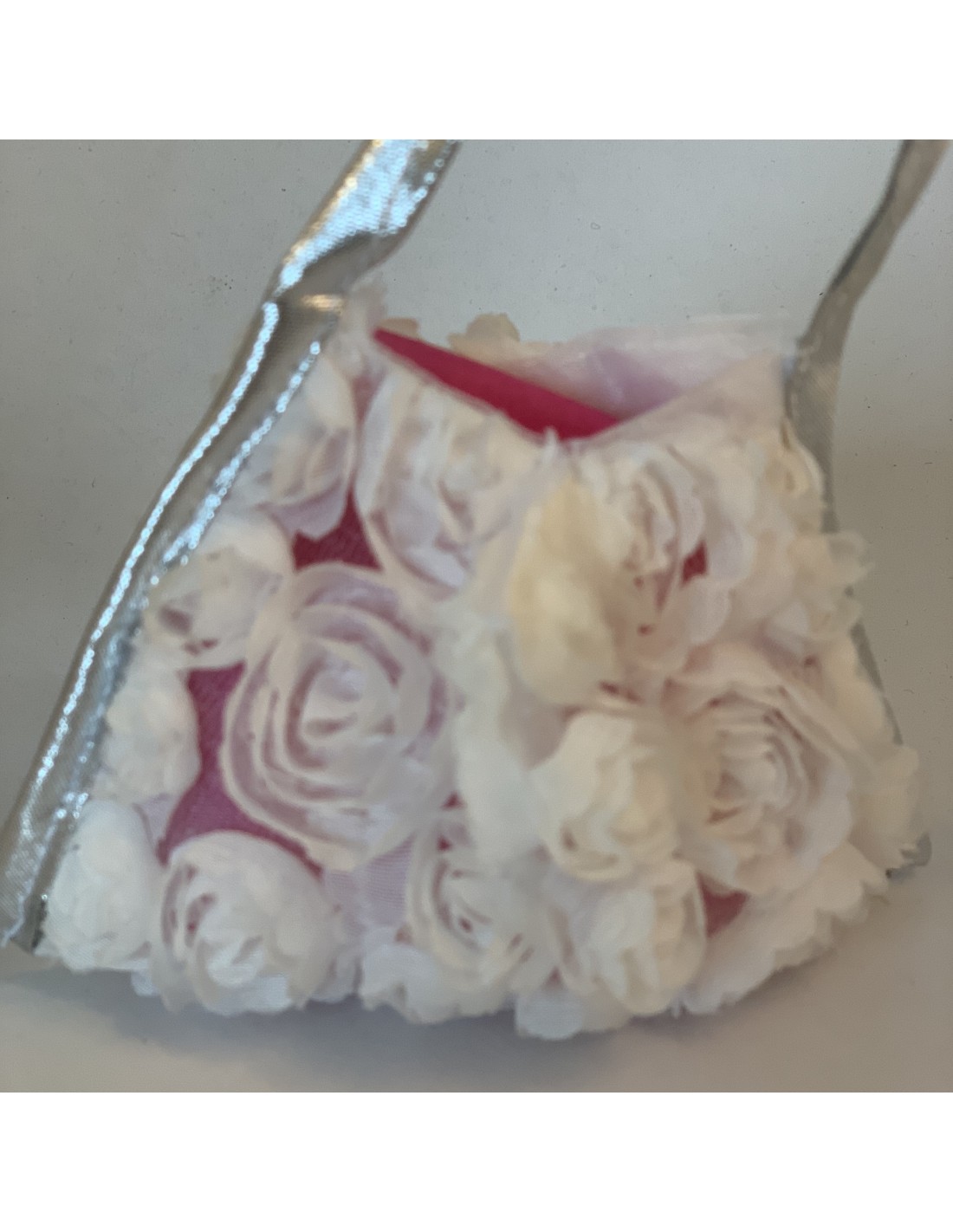 White flower tote bag , silver handle suitable for thank you gift.Cr