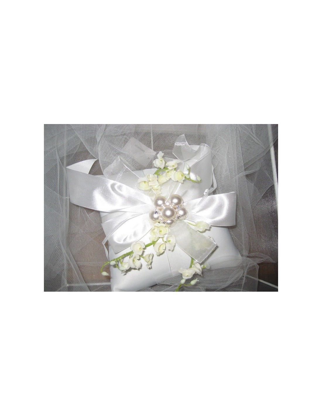 Coussin alliances perles au centre. Bouquet de muguet autour.