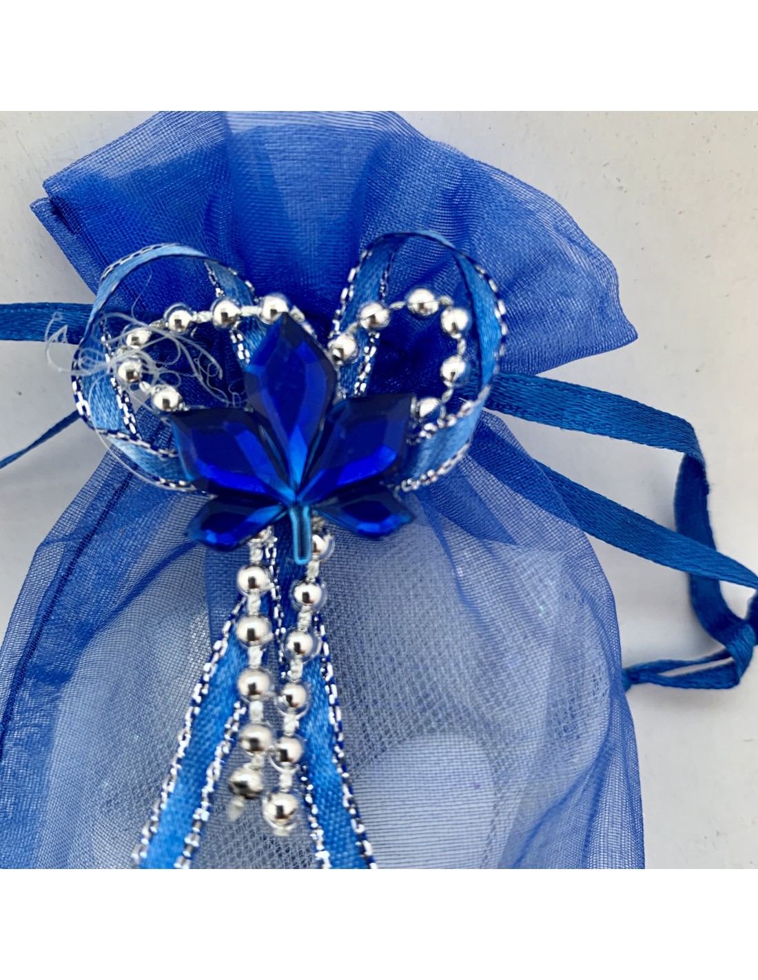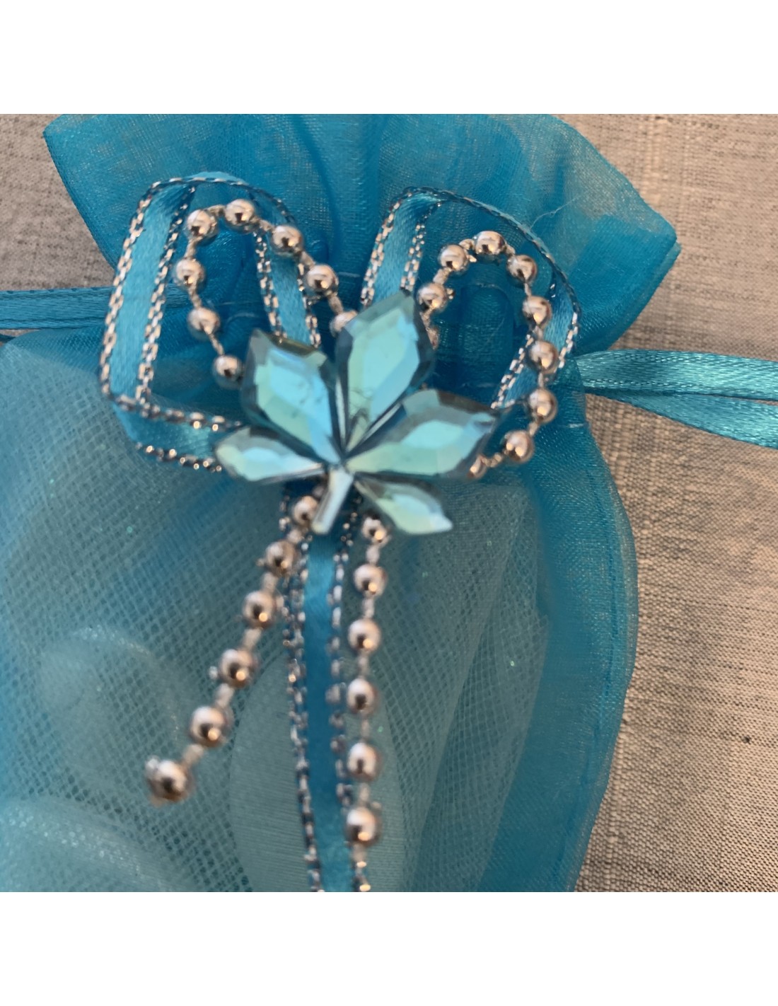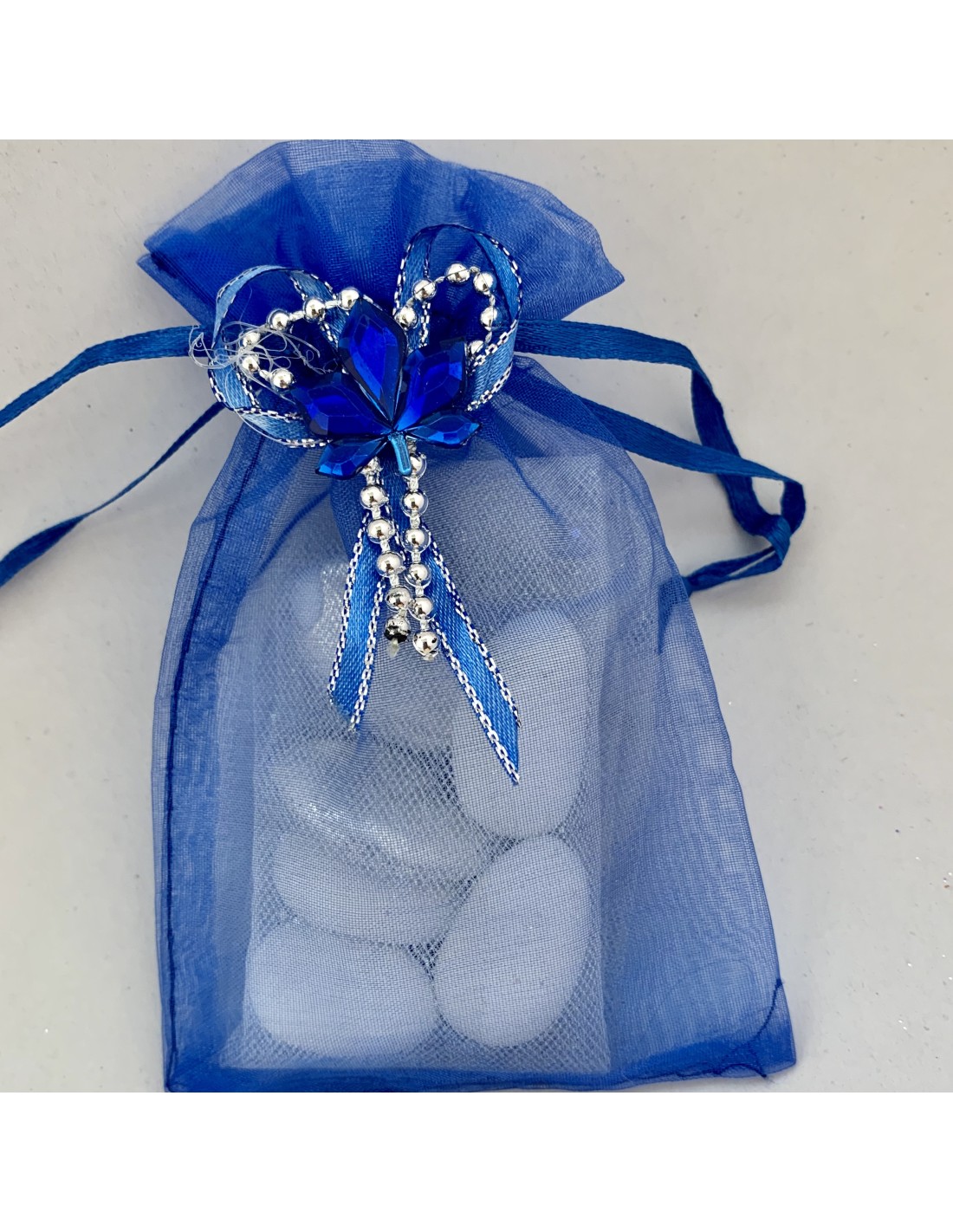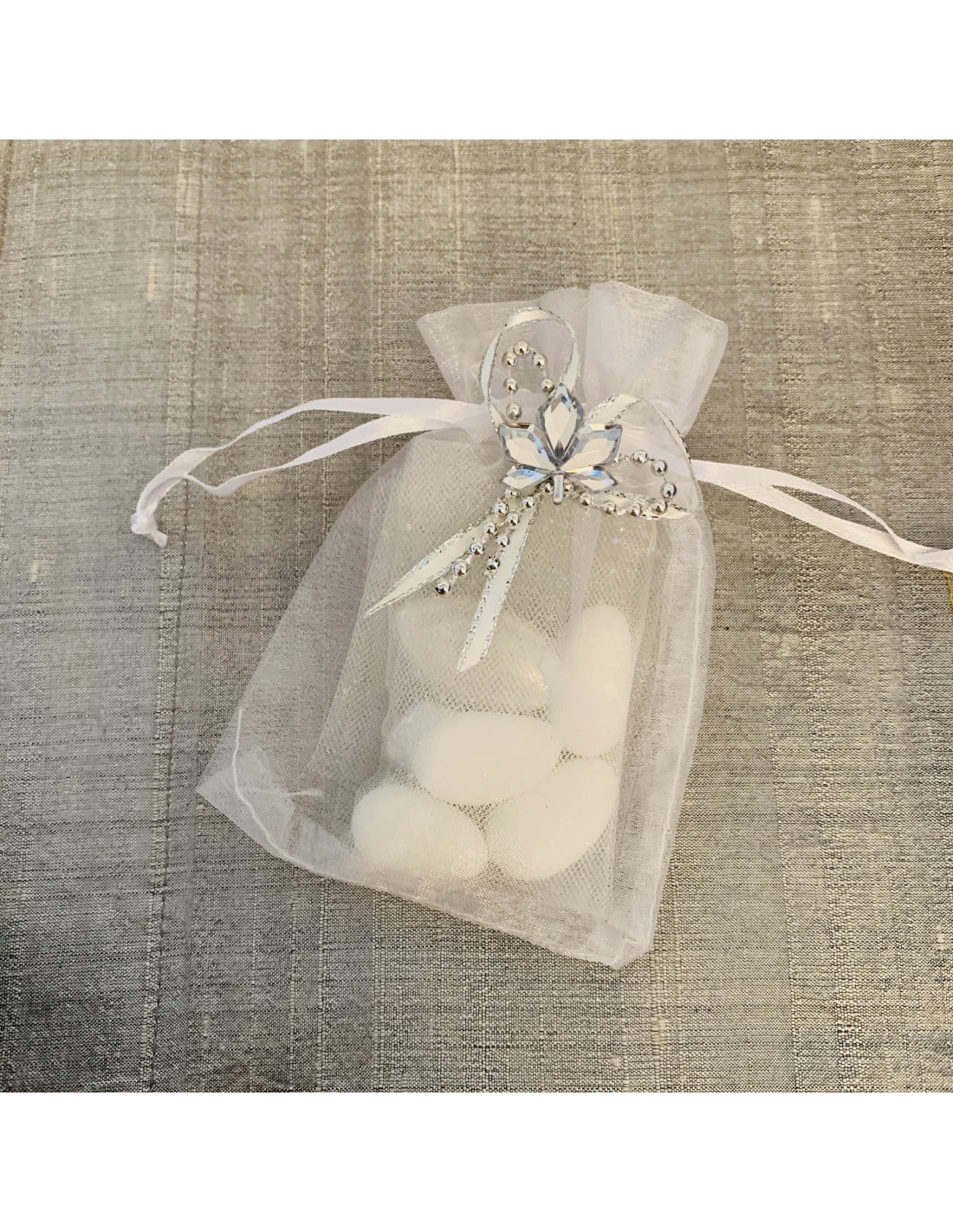 Pochon blanc en organza. Fleurs petit décor pour rehausser un pochon tout simple