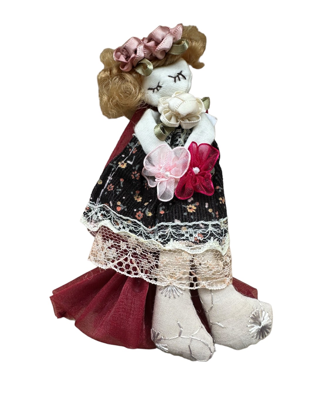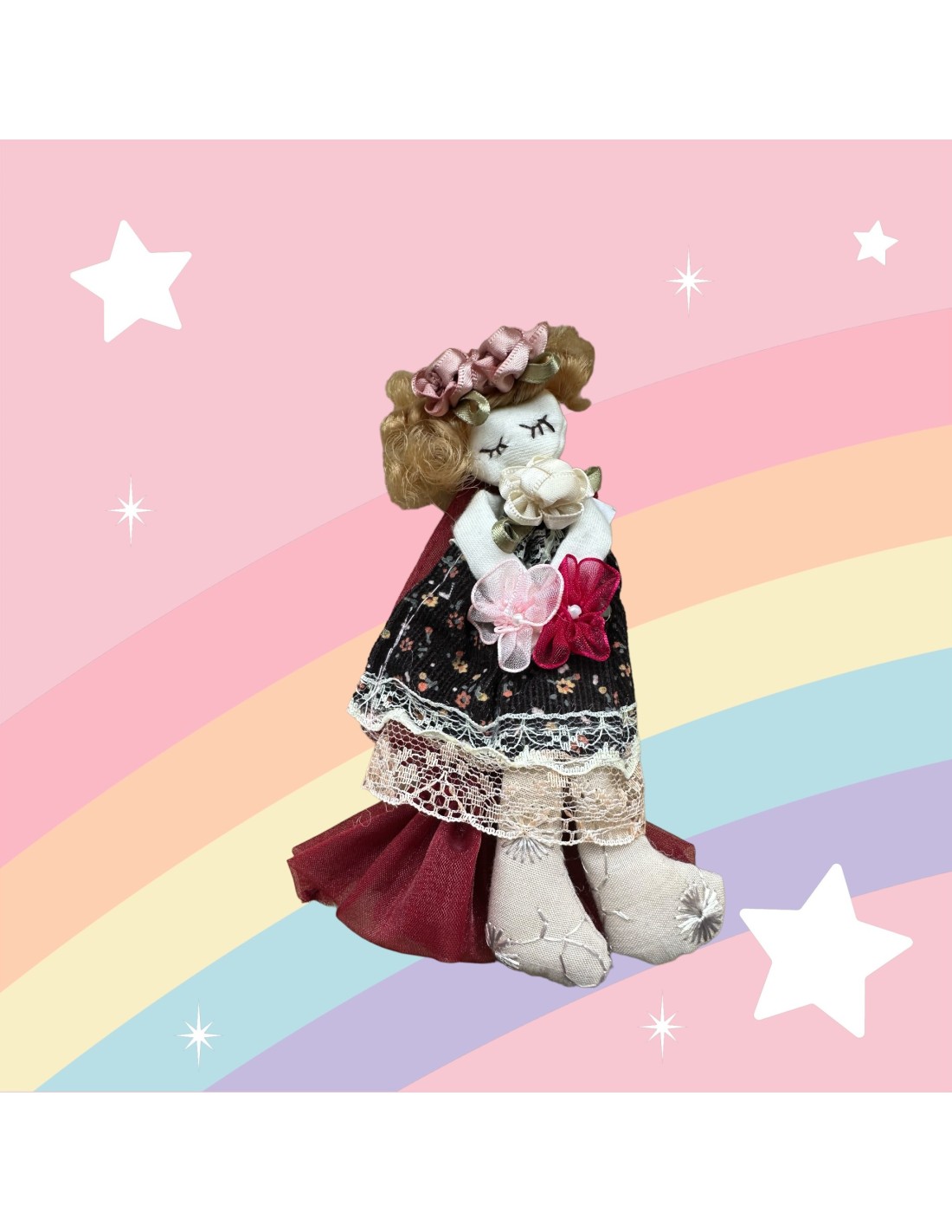 Entièrement réalisée à la main, elle séduit par ses détails délicats : une robe fleurie bordée de dentelle, des fleurs en ruban satin aux couleurs douces, et une chevelure bouclée ornée d’une couronne florale. Son visage brodé avec des yeux fermés lui donne une expression tendre et rêveuse.
