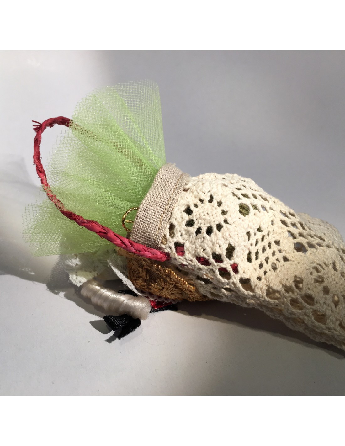Original pochon vintage décor poupée et dentelle de crochet couleur ecru.