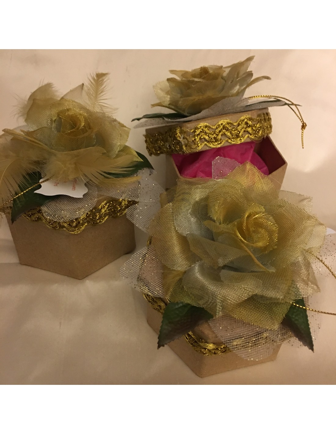 Boite en carton octogonale avec une rose en tissu de couleur or.