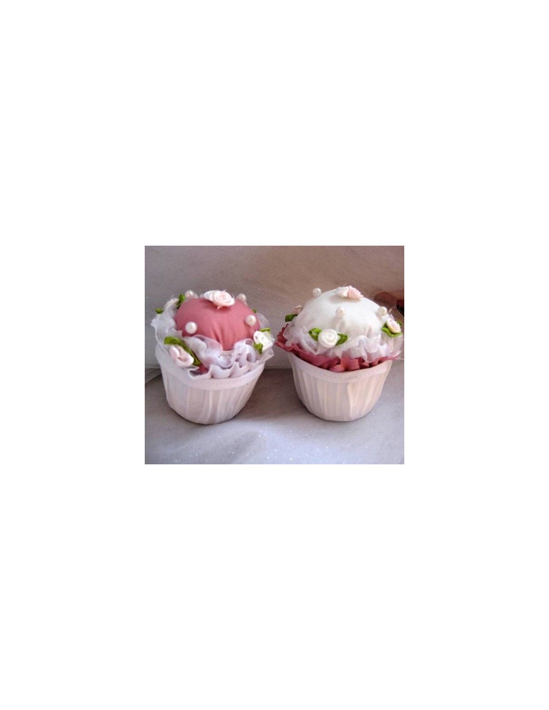 Cup cake ballotin. Tendance cup cake pour les dragées. Boite cup cake ,couvercle en tissu avec mini fleurs et mini roses,