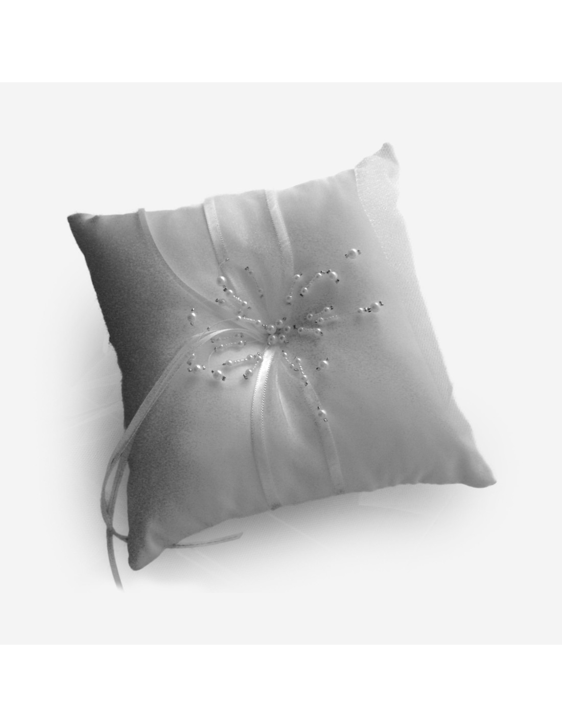 Coussin d'alliances de mariage en satin avec perles au centre.