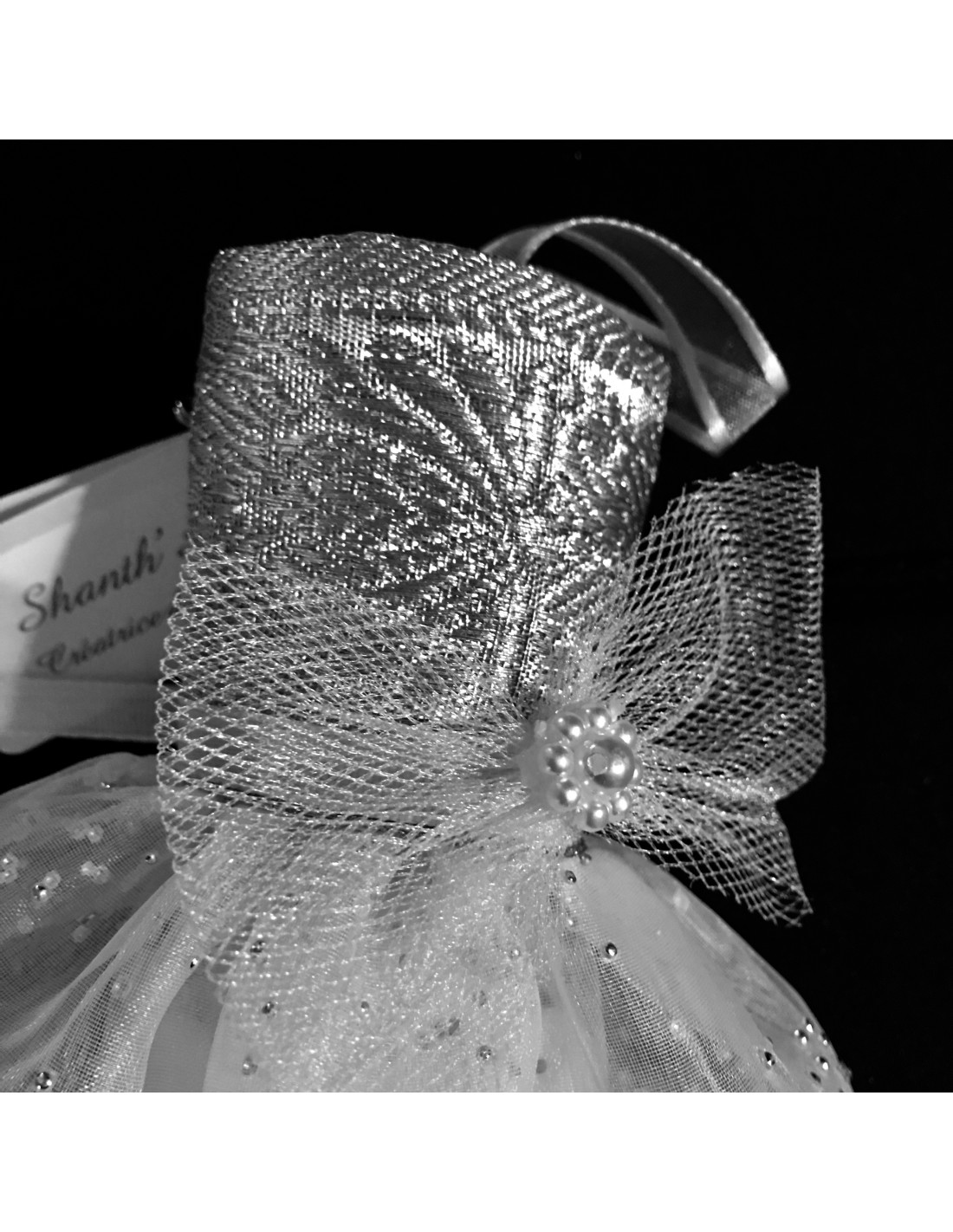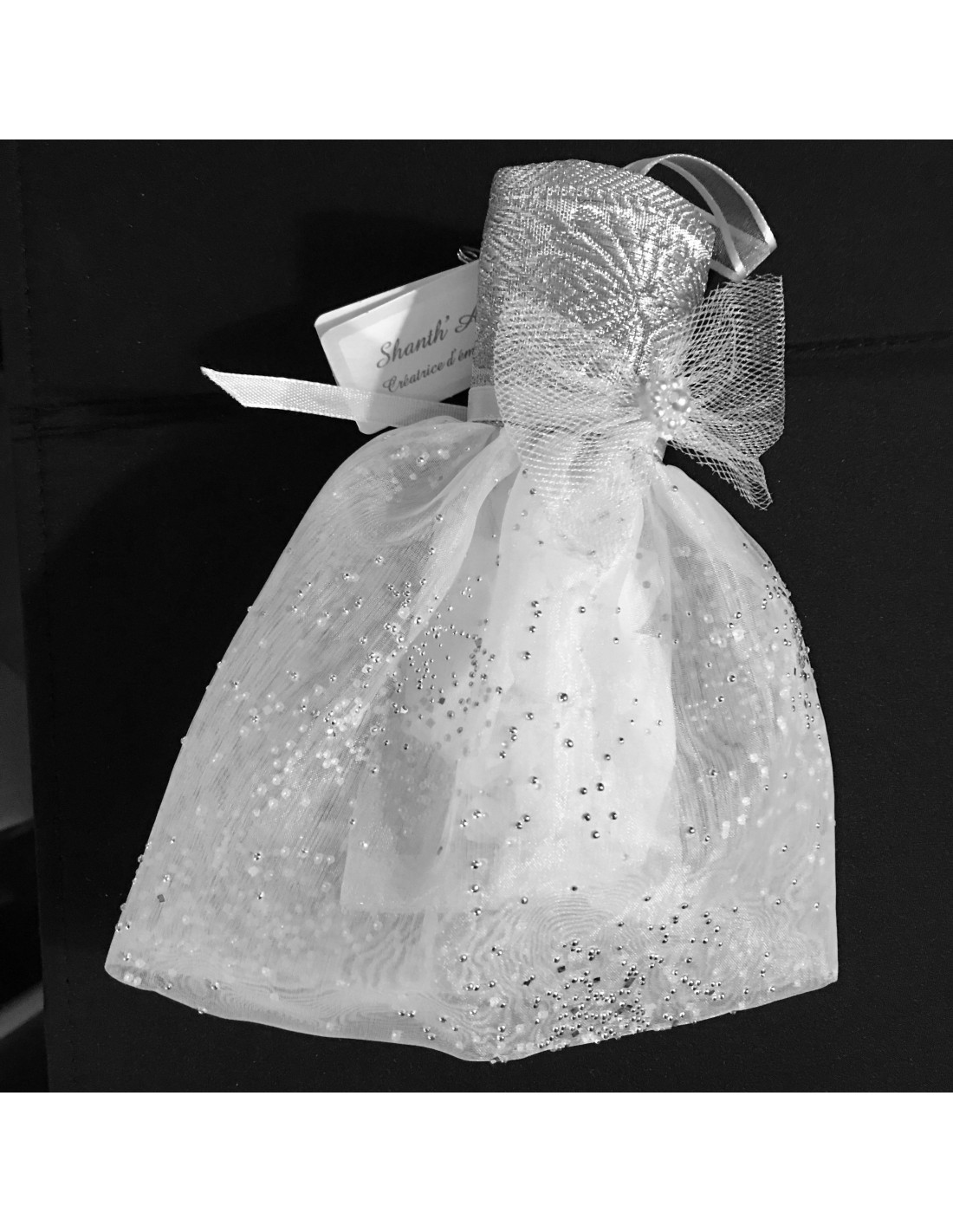 légance et de raffinement à la présentation de cadeaux ou de petits objets comme les dragées. La forme de robe évoque un style romantique et luxueux, parfait pour des occasions où chaque détail compte.