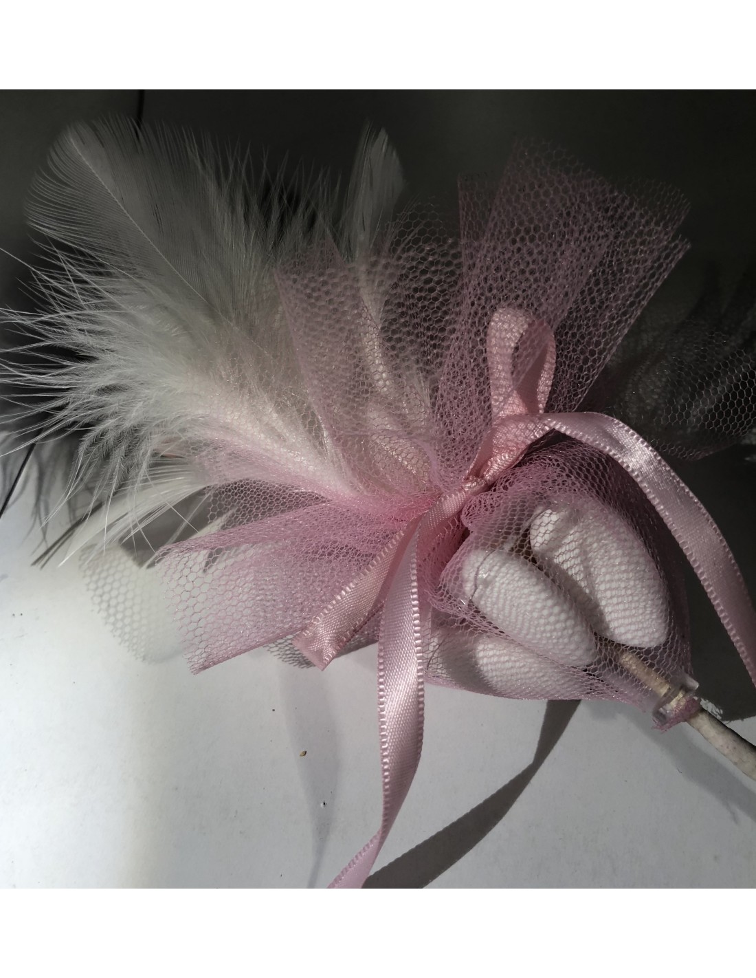 Notre plumes fleur, montage sur pique très élégant existe en blanc et fuchsia.Livraison impératif avec les dragées 5 par pic; dragees amandes lerida couleur blanc de la marque medicis.