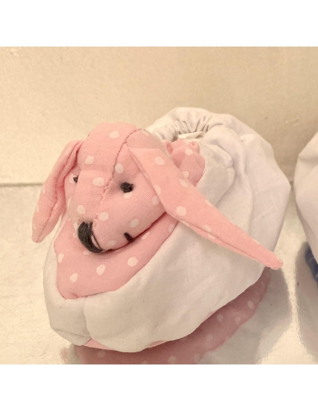 Chausson coton molletonné en forme de lapin, bicolore rose et blanc ou bleu et blanc.