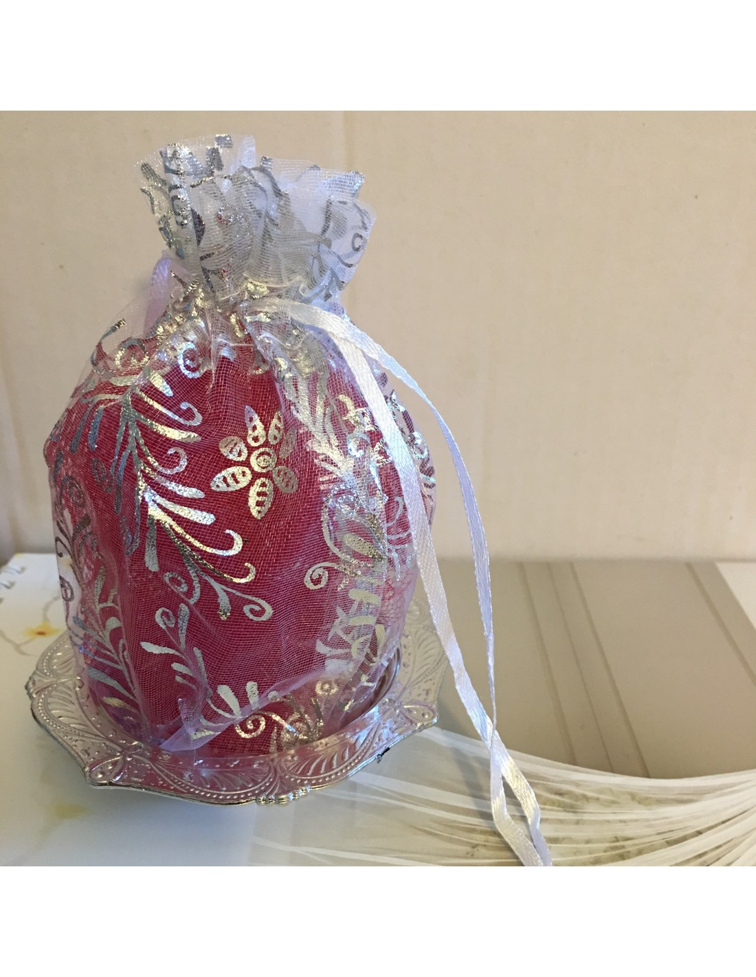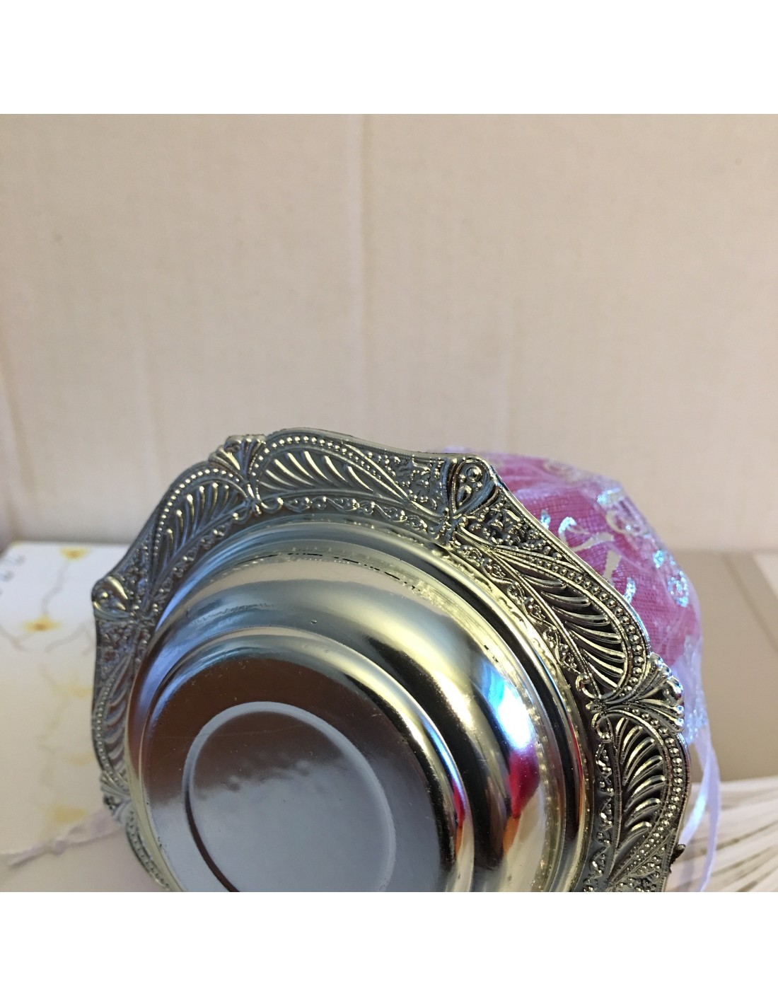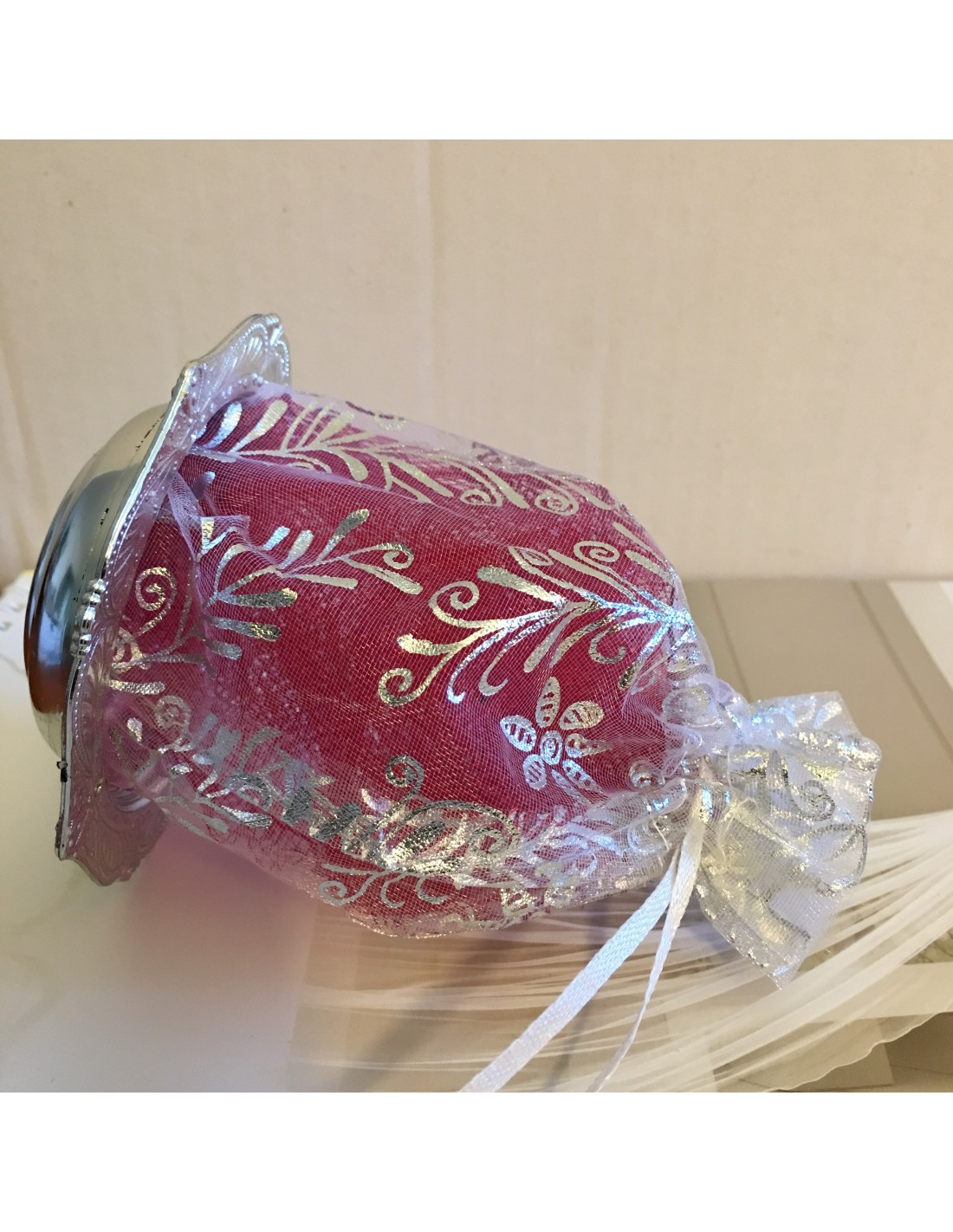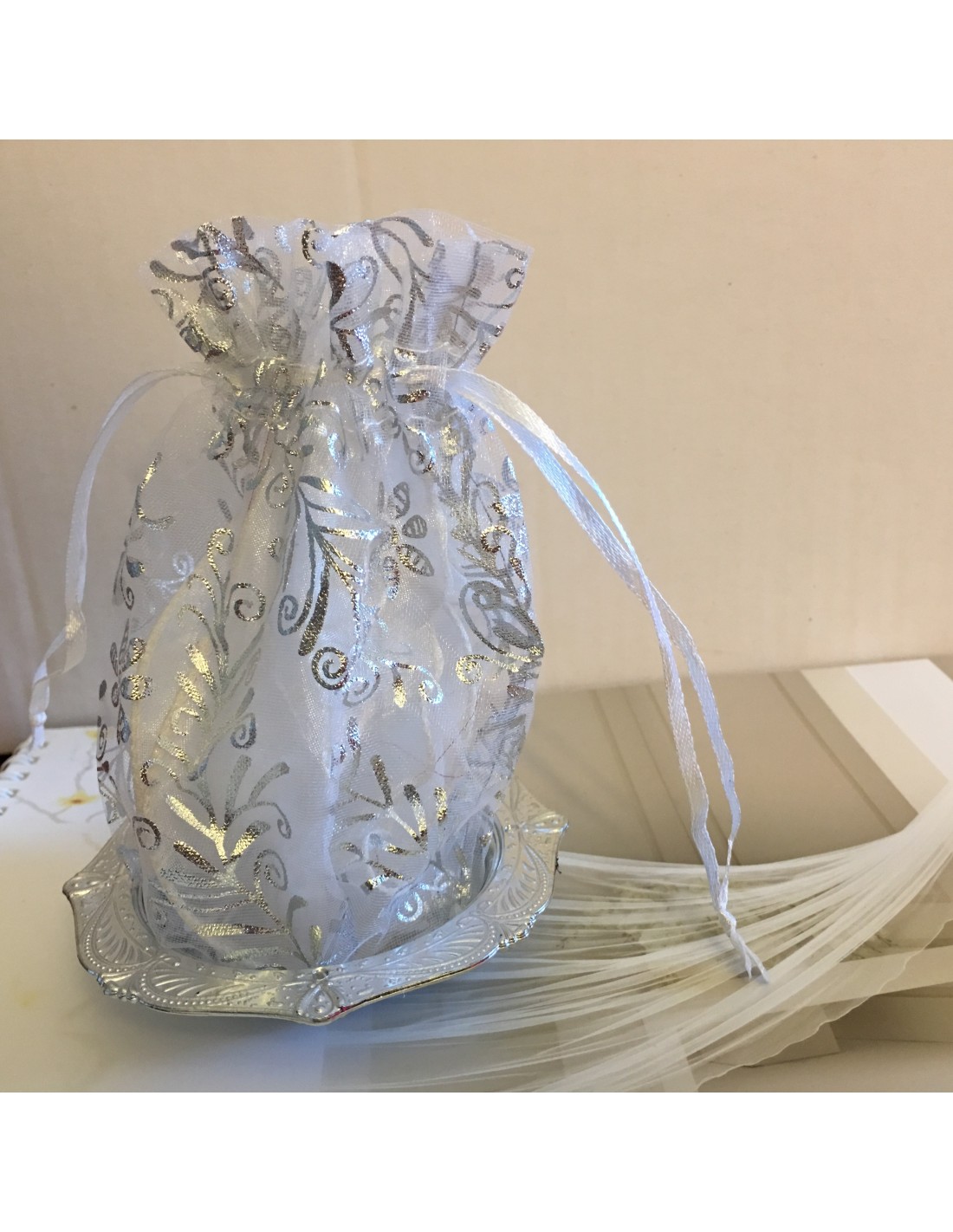 Nouveau sachet argent et blanc sur fond métal avec une cordelette pour fermer.