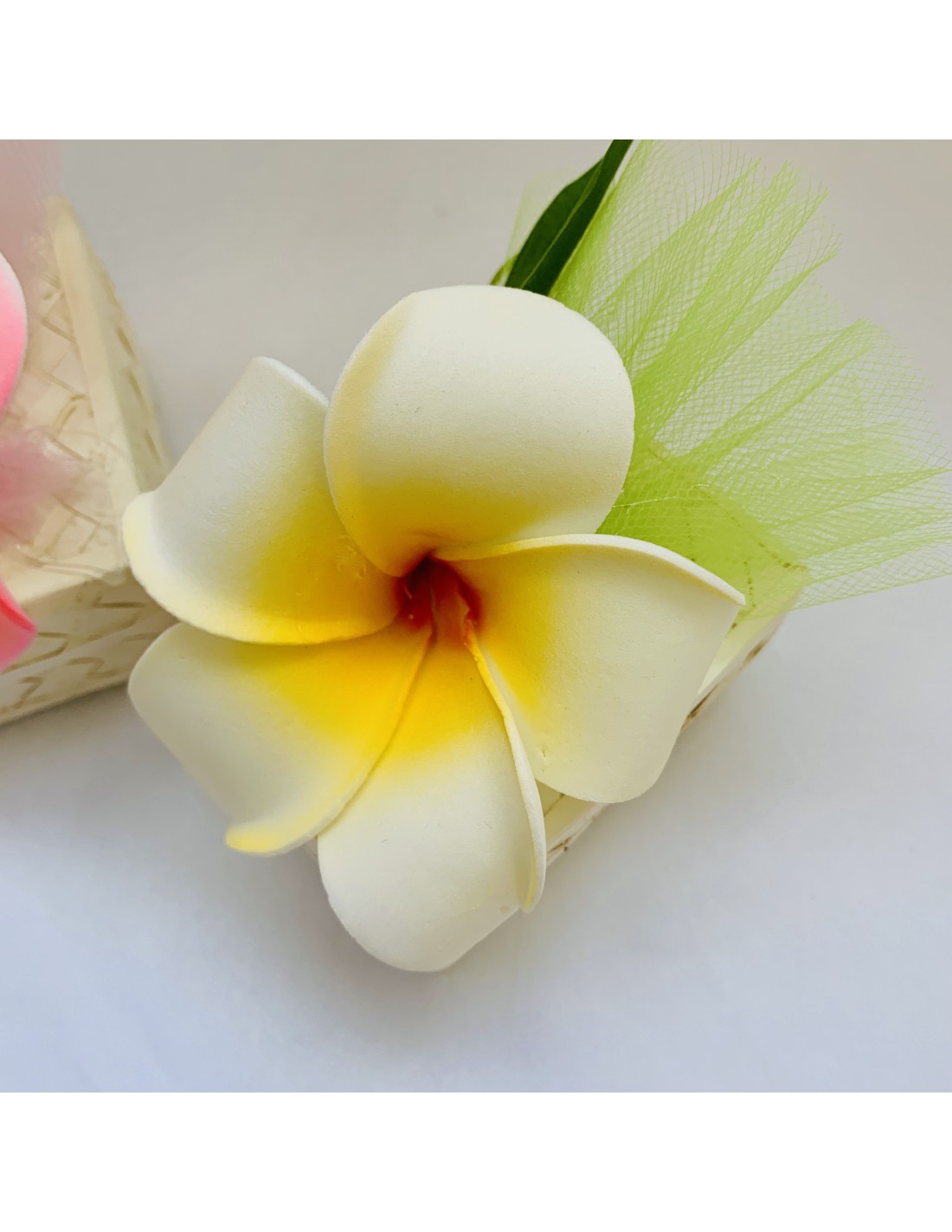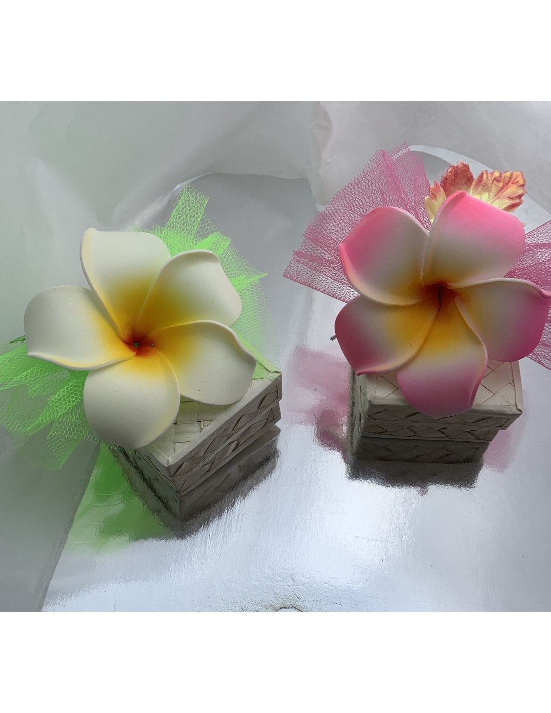 Notre boite rectangulier avec une très belle fleur frangipanier plumeria  artificielle, l'originalité qui sort de l'ordinaire.