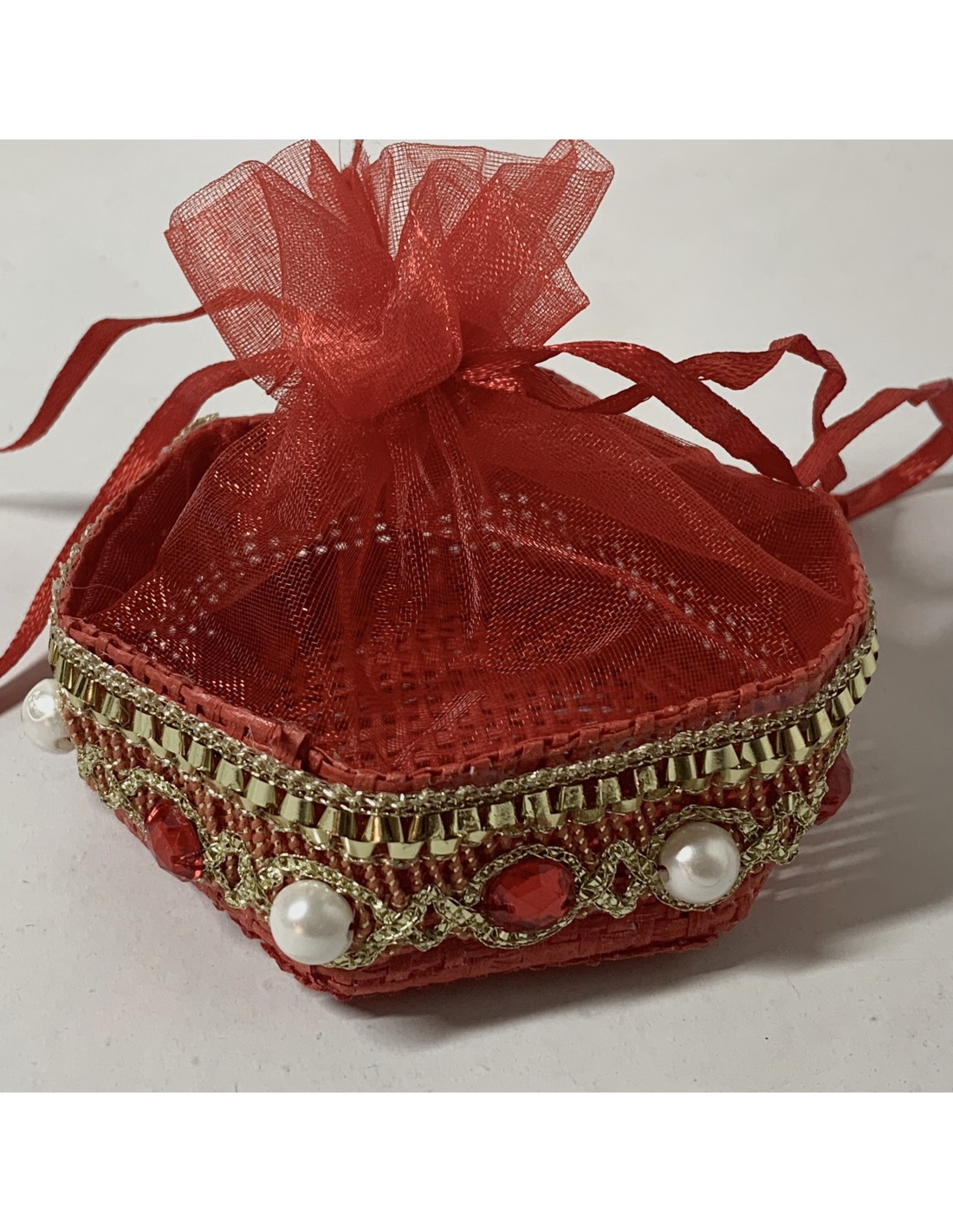 Ballotin rouge, couleur traditionnelle de l'Inde, bordure de perles et pierres.Dragées incluses.